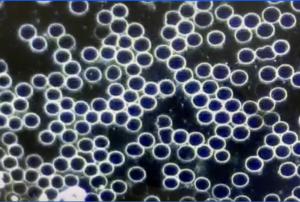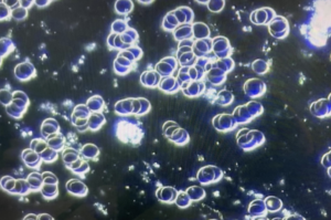 The following two slides are dark field blood examinations. The first one was taken from a 62-year-old female who had received the COVID vaccine roughly 60 days prior to the examination of the blood. Note that there is mild RBC clustering formation, consistent with minimal rouleaux formation. The slide after that shows a dark field blood exam on the same patient after six autohemotherapy ozonations (“passes”). There is complete resolution of the rouleaux formation of the blood.
